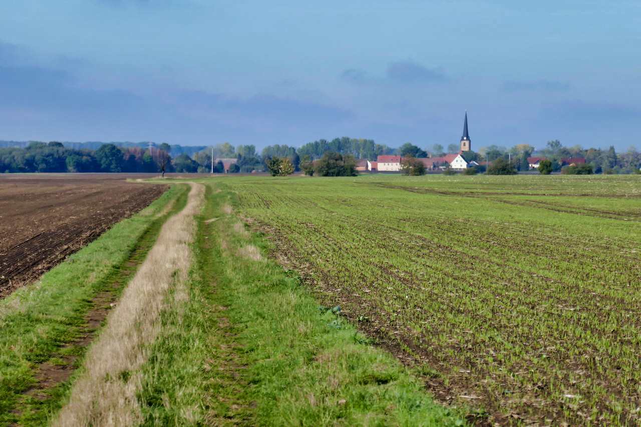 Morgens bei nassem und windigen Wetter gestartet. Witzig: der Pilgerweg verließ Merseburg durch einen Tierpark. Die Tiere hinter den Zäunen zu sehen vertiefte noch einmal zusätzlich das Gefühl, frei zu sein, diesen wunderbaren Weg zu laufen. Nach dem Tierpark wurde der Weg in bisschen eng und leider auch rechts und links von Müll gesäumt. Danach gab es wieder lange gerade Strecken. In einem der nächsten Dörfer hat mich die „Geisel“ genommen. Ich will sagen, ich habe einen kleinen Schlenker gemacht, weil ich eine Muschel nicht gesehen habe und der GPS auch nicht richtig Auskunft gegeben hat. Kam am Schloss Unterhof heraus und hatte wohl die Ehre, den Schlossherrn samt Hund kennen zu lernen.
