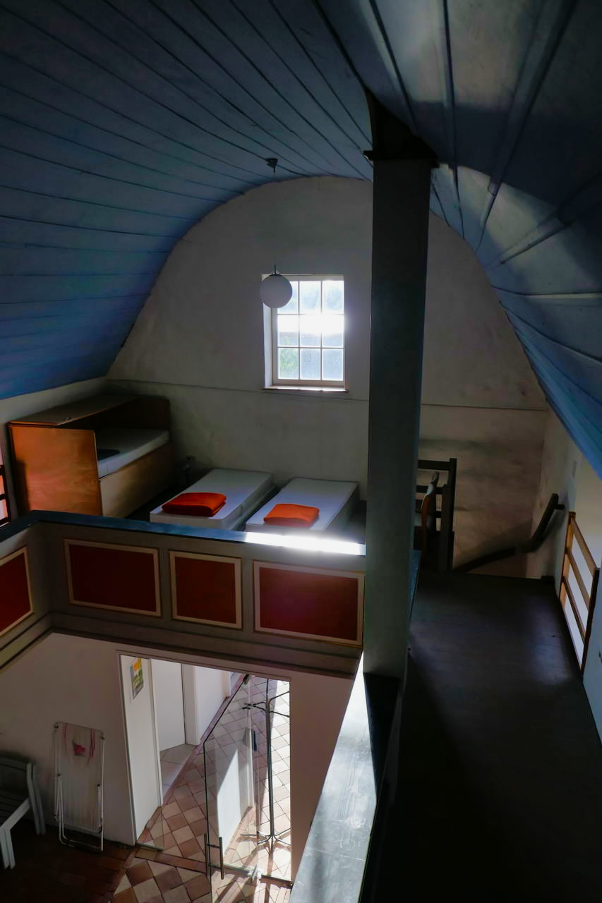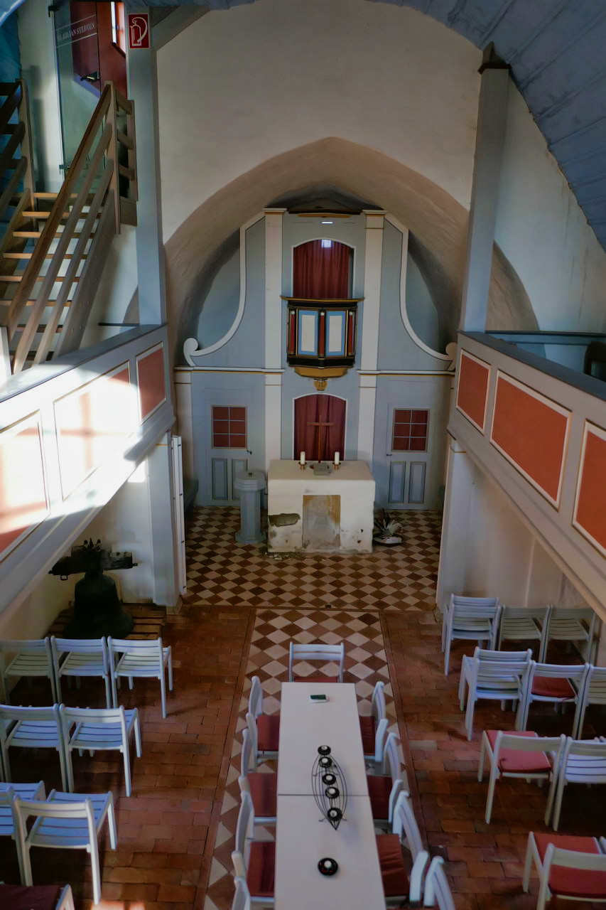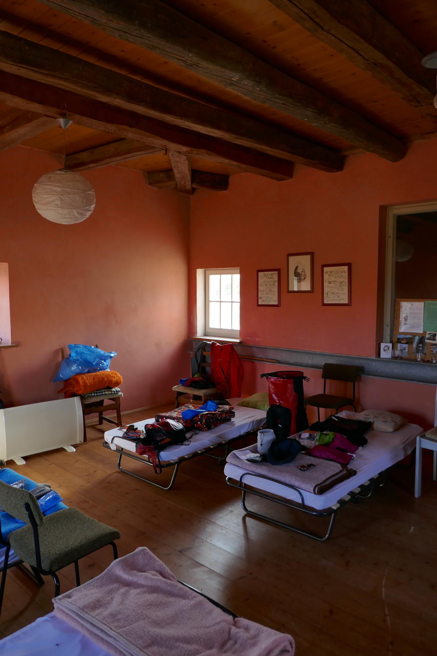 Vor Stedten, ab der Straußenfarm in Schwerstedt wurde der Weg nach etwas anstrengend, weil zugewachsen. In Stedten angekommen musste ich mich noch orientieren weil mein Ziel keine wirkliche Adresse hatte (Haus 21!). Aber der erste lebende Mensch, den ich zu Gesicht bekam, konnte mir die Richtung zeigen, in der Frau Abschlag wohnte, die ausgewiesene Herbergsmutter. Die nächsten zwei Menschen waren die Schwiegertochter von Frau Abschlag und ihre Tochter. Die beiden haben mich dann direkt zur Kirche geführt und mir die Hausordnung erklärt. Außer dem Kirchturm (siehe Foto gab‘s noch diverse Feldbetten in der Galerie. Die Kirche wird, außer als Pilgerunterkunft, lediglich zu Weihnachten für einen Gottesdienst benutzt, wie ich auf Nachfrage erfahren habe.